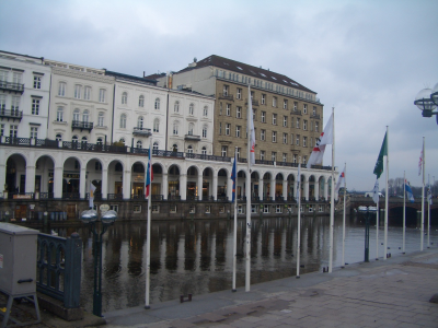 Pero no todo es trabajo. El primer fin de semana Houxiang me estuvo enseñando Hamburgo. Primero fuimos al centro de Hamburgo, donde está el Ayuntamiento. (En Alemán Rathaus) (Foto de lzquierda). En uno de los bordes de la plaza hay un canal (foto de la derecha) que desemboca en el lago pequeño.