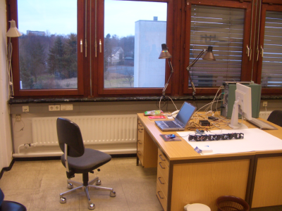 El campus es pequeño. El edificio que se ve al final (foto de la izquierda) es donde está el TAMS. Estamos en la tercera planta. Yo estoy en una habitación, de momento sólo (hay sitio para dos investigadores) (Foto de la derecha). Ahí podéis ver mi portátil y esa cosa negra alargada que es el nuevo robot en el que estoy trabajando: Hypercube, una versión mejorada de Cube Revolutions.