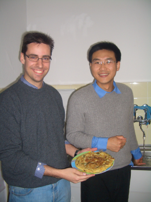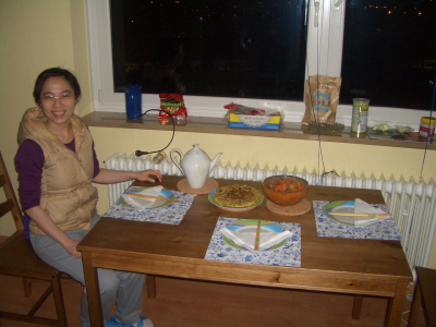 Casi todos los fines de semana, Houxiang y su mujer, Yanran, me invitan a cenar a su casa. Uno de los días decidí intentar hacer una auténtica tortilla española! Y la cosa parece que salió bien (Foto de la izquierda). En la derecha está Yanran, en la mesa, con la tortilla y un plato de comida china. Fijaros en que no hay cubiertos: sólo palillos. Claro, estoy en casa de unos chinos :-)