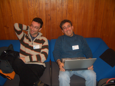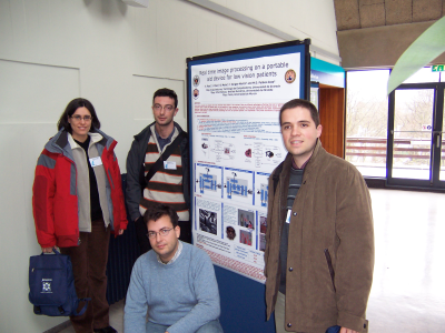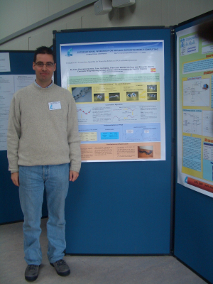 En uno de los descansos colocamos los posters. Todos nuestros artículos fueron aceptados para presentación oral, pero muchos decidimos presentarlos como pósters. El único que se lanzó al ruedo para presentar su artículo fue Javier Díaz y por eso no está en la foto de la izquierda, con sus compañeros: Sonia, Eduardo, Rodrigo y Rafa. Estaba preparando la presentación. En la foto de la derecha estoy yo con mi póster.