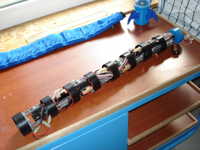 Un prototipo que pudimos ver en primicia (todavía no hay nada en la web) es una serpiente acuática, que se mueve por el agua (Foto de la izquierda). Sobre la estructura mecánica sitúan una especie de funda hecha del mismo material que los trajes de submarinismo. Aunque no lo vimos funcionando, nos pusierion un vídeo del bicho en acción. En ese mismo laboratorio tenían una mini-piscina para hacer pruebas.
