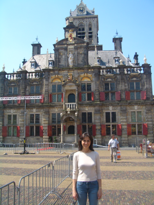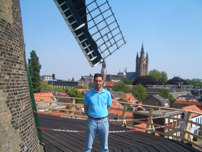 Y ya para finalizar las vacaciones, el viernes 9 nos fuimos por la mañana a Delft. En la foto de la izquierda está Mercedes junto al ayuntamiento y en la derecha estoy yo subido a uno de los típicos molinos.