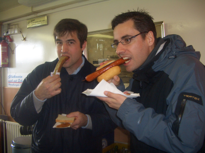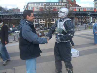 El lunes 1 de Mayo quedamos pronto para enseñarles a Carlos y Vir Hamburgo. Después de ver los sitios típicos, nos fuimos al puerto y nos tomamos unas clásicas salchichas (foto de la izquierda). En el puerto había mucha animación (era fiesta por ser el 1 de Mayo). Me llamó la atención uno de los mimos que había, que estaba haciendo de “robot”. No pude por menos que sacarme una foto con él (derecha).