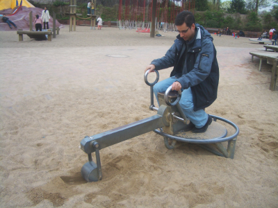 Por la tarde estuvimos en uno de los múltiples parques que hay en Hamburgo. Además tuvimos la suerte de que el tiempo nos acompañó. En la foto de la izquierda estamos descansando al lado de una fuente. En el parque había una zona infantil muy divertida. Además de todo tipo de columpios, había una excavadora que se controlaba con dos palancas. ¡Era muy divertida! Y claro, la tuve que probar (foto de la derecha).