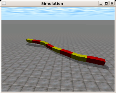También he finalizado las rutinas necesarias para simular el robot, utilizando el motor físico Open Dynamic Engine (ODE). Los mismos movimientos conseguidos en el robot real funcionan perfectamente en este simulador, por lo que ya está listo para implementar las funciones de evaluación para trabajar con algoritmos genéticos. El simulador se puede ver en la foto de la izquierda.