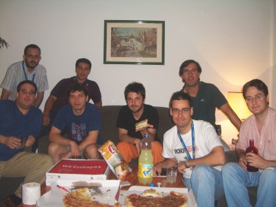 ¡¡Ya estábamos todo el equipo!! Lo celebramos en una de las habitaciones, tomando pizzas y vaciando el minibar :-) (Foto de la derecha). En la parte delantera, de izquierda a derecha: Ricardo, Iván, Gedeón, Juan y Andrés. En la parte trasera, también de izquierda a derecha: Pepe, Jose y Alejandro.