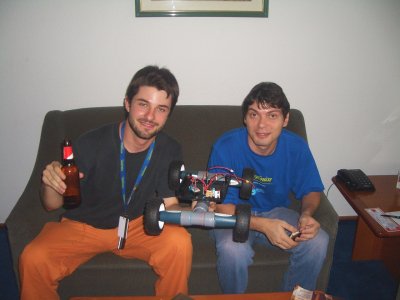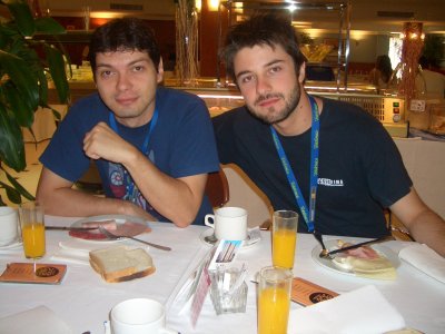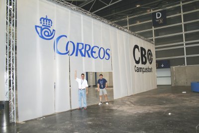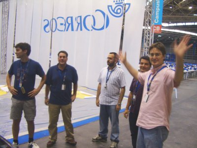 El domingo 23, Iván, Gedeón y yo tomamos un desayudo estilo campus a las 9:30h (foto de la izquierda), compuesto de tres platos: primero, segundo y postre ;-) Y luego nos fuimos a la campus, a ver cómo iban las cosas. En la foto de la derecha estamos Iván y yo, junto al “Cubo” del área de campusbot. Nuestro patrocinador era Correos... y nuestro nuevo lema era “Correos Campusbot” :-)