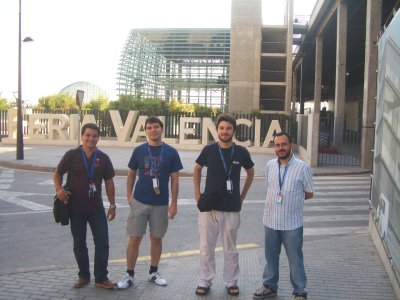 Por la tarde nos acercamos a la feria de Valencia, donde se celebraría la Campus. Allí estuvimos con Miguel Ángel expósito, el director de contenidos de Campus Party. En la foto de la izquierda están Miguel Ángel y Alejandro, en uno de los pabellones. Recogimos todas las acreditaciones, las nuestras y la de todos los colaboradores de CampusBot y echamos un vistazo al área de CampusBot. ¡¡Casi todo estaba listo para el gran día!!