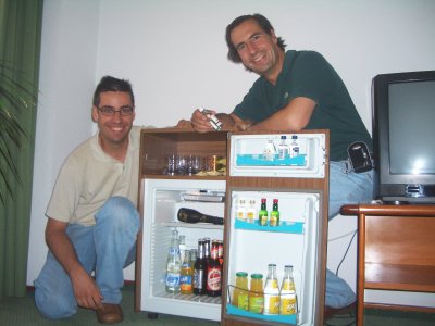 Salimos desde mi casa (foto de la izquierda) y llegamos a Valencia sobre las 14h. Fuimos directamente a Leroy Merlín a comprar las superficies para hacer los circuitos de las competiciones de Robotrakers, velocistas y el mogollón. Comimos y nos fuimos al hotel a descansar (Estuvimos en el mismo hotel del año pasado: hotel Feria). Y claro, aprovechamos para pasar revista al minibar (foto de la derecha). Todo estaba en orden ;-)