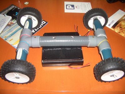 En la foto de la izquierda se puede ver la parte inferior del robot Rob-in de Gedeón. Es un diseño muy original. La estructura está constituida por tubos de PVC y para los motores utiliza 4 destornilladores eléctricos. Por eso este robot quedó bautizado con el nombre de “Destornillator” entre todos nosotros ;-)