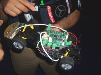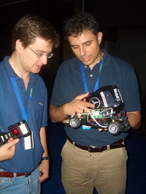 Después de la presentación comenzaba el taller de SPEED RUNNERS, impartido por Julio Pastor. En la izquierda, Julio le está enseñando el prototipo a Andrés. En la derecha se pueden ver más detalles del coche-robot. ¡¡¡Una auténtica maravilla!!!