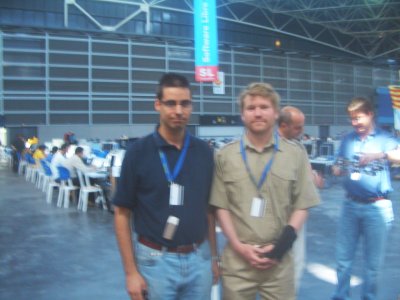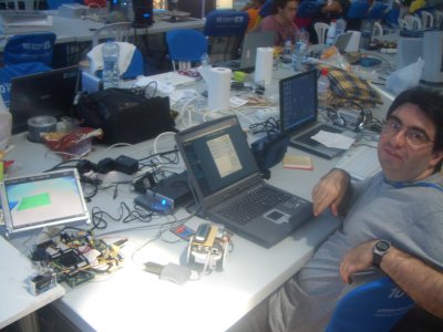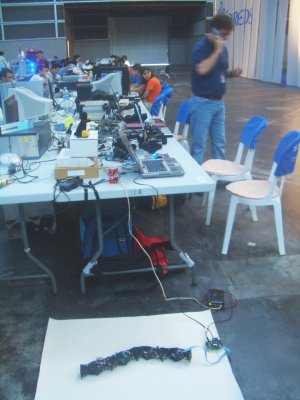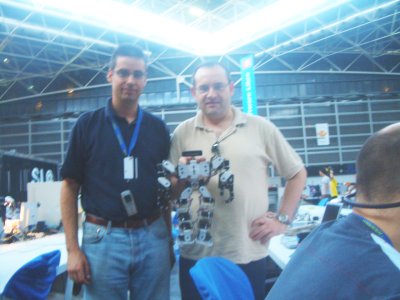 Toda la gente ya estaba a pleno rendimiento, instalados en sus puestos y con los robots a punto para frikear. En la izquierda podemos ver a Daniel Quintero, con su robot Telemaco (que fue el ganador de la prueba libre). Y en la derecha estoy con Julio Montagut, el webmaster del jvmbots. Nos conocíamos por la lista de microbótica y por habernos intercambiados algunos mails, pero no nos conocíamos en persona. Me encanta poder poner “caras” a la gente que conozco por Internet ;-). Me estuvo enseñando su nuevo robot bípedo. La estructura mecánica es fantástica!!