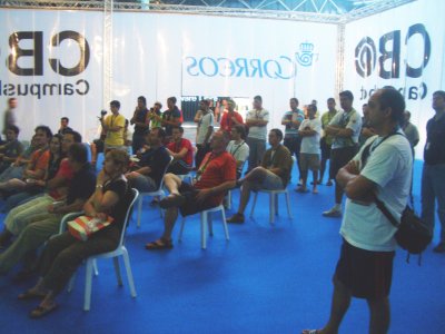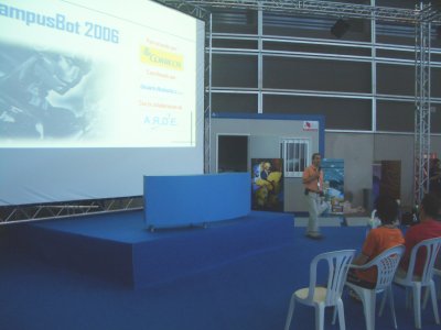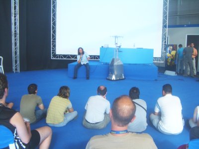 El martes comenzaron las actividades en todas las áreas. En el área de CampusBot, sobre las 11h de la mañana, Alejandro explicó todas las actividades que se habían preparado para la semana. Todas las conferencias se llevarían a cabo en el “Cubo”, el mismo sitio donde Alejandro estaba dando la charla de presentación (foto de la izquierda). En la derecha se pueden ver algunos de los asistentes que se acercaron.