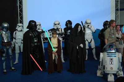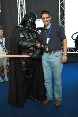 Por la tarde, después del taller de robótica de los Skybots, David Calkins trajo su unidad R2D2, acompañada por los personajes de Star wars de la asociación Saga Skywalker de Valencia (foto de la izquierda). Fue todo un éxito. Cientos de frikies de la Campus fueron a Campusbot a hacerse fotos con los personajes. Y claro, yo no soy menos. En la foto de la derecha estoy dando la mano a Darth Vader ;-) . Os recuerdo que mi nick es Obijuan jajajaja