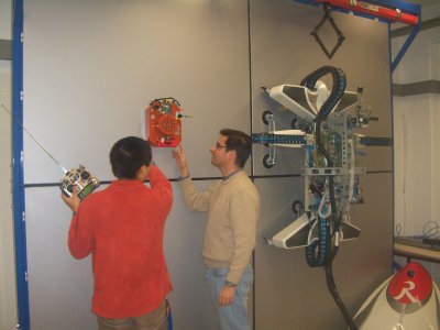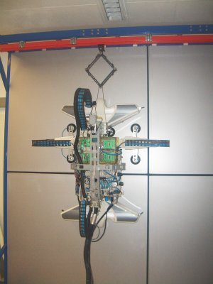 Otro de los robots es Gecko. Se trata de un robot móvil, con ruedas, que es capaz de subir por superficies verticales gracias a un motor que hace el vacío entre la base del robot y la pared. En la foto de la izquierda Houxiang está moviendo el robot por la misma pared que el Skycleaner. Aunque también es un robot autónomo, uno de los modos de funcionamiento es utilizando un mando de radio control. En la foto de la derecha Gecko se está moviendo por una de las paredes del laboratorio. Es una pared normal, con rugosidades y pintada de blanco.
