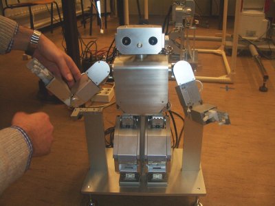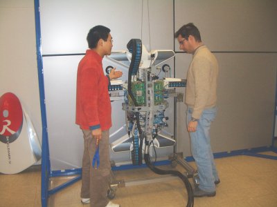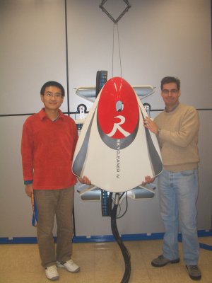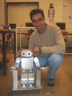 En el grupo hay investigadores trabajando en visión y coordinación. Han comprado dos robots humanoides Hoap-2 de Fujitsu (foto de la izquierda). En la derecha estoy posando junto a uno de ellos, para que se pueda apreciara su tamaño. ¡Vaya juguetitos! :-)
