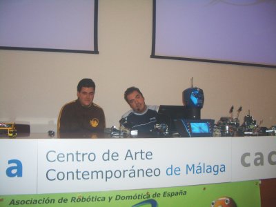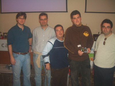 A los miembros de AMUCA los conocemos muy bien de haber asistido a las tres jornadas de robótica que han organizado en la universidad de cádiz [2004] [2005] [2006]. En la foto de la izquierda estamos, de izquierda a derecha: Andrés Prieto-Moreno, Juan González, Francisco Cordón, Rafael González y Daniel Quintero.