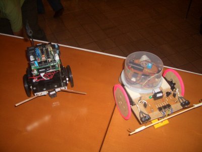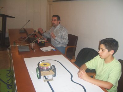Al día siguiente por la mañana continuaron las jornadas. En primer lugar estuvo Franciso Reinoso (Furri) con su hijo hablando sobre la nueva versión del popular robot Tarribot: el mini-tarribot. En la foto de la izquierda su hijo está haciendo una demostración de mini-tarribot siguiente una línea negra. En la derecha se pueden ver el Skybot junto al minitarribot.