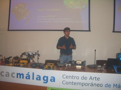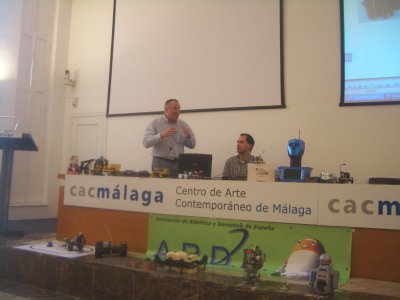 Luego llegó el turno de las asociaciones. En primer lugar Jose Antonio Casas, estudiante de doctorado y responsable de la sección de robótica, e Hilario Tome hablaron sobre la asociación AESS estudiants (foto de la izquierda) y después Rafael González y Francisco Cordón sobre AMUCA, la asociación de robótica de Cádiz y nos presentaron el robot Andalbot, que es el que usan para sus talleres de robótica.