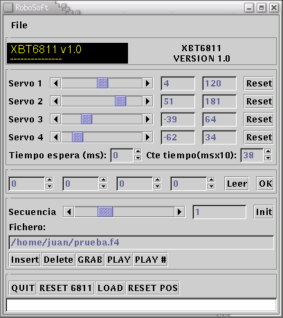 Este es el caso del programa XBT6811 que permite controlar la posición de 4 servos de una BT6811 conectada por el SPI a una CT6811 que a su vez está conectada al PC por el puerto serie. Mediante una interfaz muy simple se pueden generar secuencias de movimiento, que se almacenan en ficheros para su posterior reproducción. Esto permite realizar prototipos de robots o sistemas articulados de una manera muy rápida.