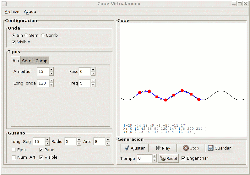 Cube-virtual.mono en acción. En la parte de la derecha se muestran las articulaciones del gusano (puntos rojos) y los segmentos que las unen (líneas azules) que están sobre la onda de generación de movimiento. En la parte inferior derecha están los botones que permiten hacer las simulaciones. En la parte izquierda se definen los parámetros de la onda y del gusano.