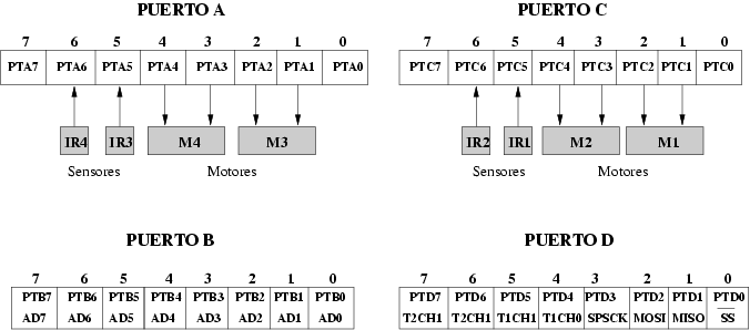 Algunos de los pines tienen otras funciones. Si además se usa la tarjeta GP_IFAZ, se usan 4 pines de entrada para los sensores y 8 pines de salida para los motores: