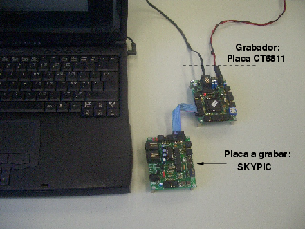 En la siguiente foto se muestra un ejemplo de utilización. Como grabador se usa una tarjeta CT6811 con el servidor PICP. A través de un cable plano de bus se conecta la tarjeta SKYPIC, que lleva el pic16F876A que se quiere grabar.
