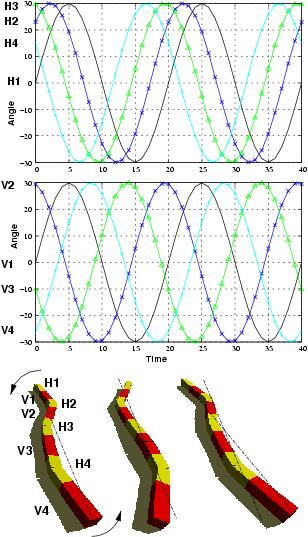 Figure: Rotating gait. Eight different sinusoidal CPGs are used. A phase difference of 50 degrees is applied to the horizontal joints and 120 for the vertical |