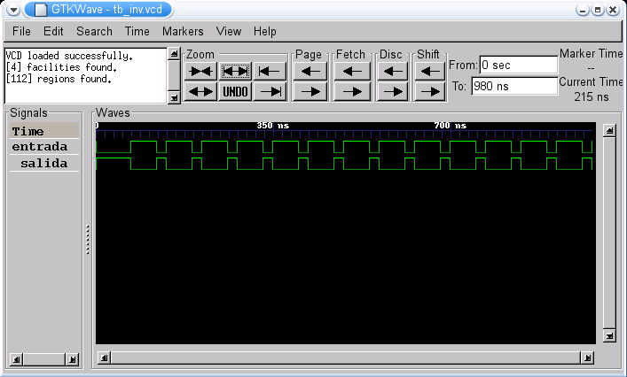 Se genera el fichero tb_inv y al ejecutarlo comienza la simulación. Hay que especificar su duración y el archivo en el que se volcarán los resultados (fichero tb_inv.vcd):