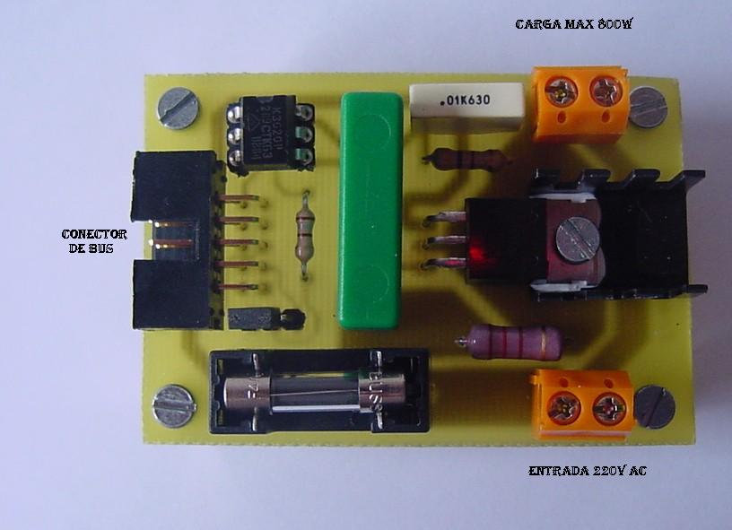 Tarjeta de prueba con un optoacoplador para controlar un triac, conector para cable de tipo bus y clemas para la conexión de la carga a manejar y la entrada de 220 voltios. Se conecta directamente a los puertos de la tarjeta Skypic. Se ha desarrollado para poder manejar cargas en corriente alterna no inductivas.