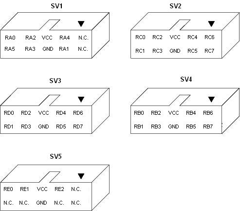 La tarjeta GEYDi saca al exterior todos los pines del PIC, a través de conectores acodados para cable de tipo bus de 10 hilos. En todos los conectores se encuentran VCC y GND. Esto es muy útil porque permite conectar periféricos y que se alimenten directamente a través del cable de BUS, sin tener que tirar otro cable.