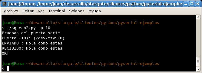 Este ejemplo hace exactamente lo mismo que sg-eco1.py, pero ahora se le pasa como argumento el número de puerto serie a emplear. Se ha divido en dos ejemplos para separar la parte de comunicaciones serie con la de análisis de los argumentos, para que quede más claro. Pero funcionalmente son equivalentes.