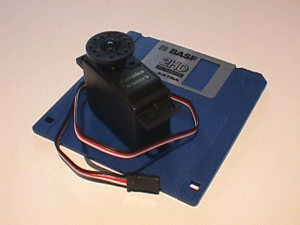 En la foto de la izquierda se pueden dos servos recién comprados. Además del propio servo, incluyen tornillos y diferentes coronas que se colocan en el eje de salida. En la foto de la derecha se muestra un servo junto a un disco de 3 y 1/2 ", para apreciar su tamaño. Obsérvese el conector que tiene, que incluye tres cables: dos para la alimentación (rojo y negro) y otro para la señal de control (blanco). Una vez trucado sólo tendrá dos cables