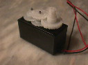 Paso 13. En la figura se aprecia el aspecto del servomecanismo trucado. La primera diferencia respecto al principio está en el cable de conexión, ahora no es triple sino doble. Pero la más importante es que ahora puede girar contínuamente, es decir giros completos de 360 grados. Llegado a este punto se tendrán preparados los motores del microbot y se podrá abordar la construcción de la estructura mecánica. |