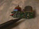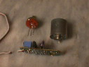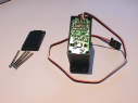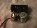 Paso 4. Una vez hecho lo anterior se puede presionar con un destornillador el saliente mecánico que se esconde debajo del engranaje más grande (eje de salida). Se observará cómo el circuito electrónico sobresale por debajo. Ahora se puede hacer palanca para extraerlo entero. En la figura se muestra la apariencia de ese circuito electrónico una vez extraído. Hay dos cilindros y un circuito integrado. Uno es el potenciómetro de control (en la figura a la izquierda), el otro es el motor (En la figura a la derecha). |