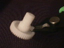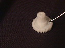 Paso 8. Ahora se elimina la limitación mecánica. Esta consiste en un pequeño saliente situado en el engranaje que forma el eje de salida del servomecanismo. En la figura se puede apreciar dicho engranaje y la situación del saliente. Para cortarlo se pueden emplear unas pinzas, lima, etc... lo importante es no dañar las muescas de la rueda dentada, o peor aún partir el eje. En caso de que esto ocurra se puede intentar pegar con 'Super Glue 3'. |