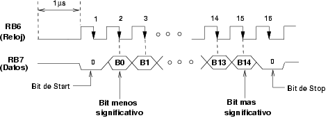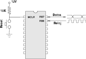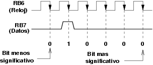 Para realizar la comunicación se utiliza un protocolo serie síncrono. Son necesarios dos hilos, del puerto B, uno para llevar los datos (conectado a RB7) y otro para el reloj (conectado a RB6).