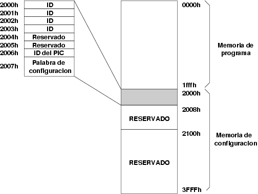 Dentro de la memoria de configuración, existe una región, comprendida entre las direcciones 2000h y 2007h, que tiene información importante. Primero se encuentran 4 posiciones disponibles para que el usuario guarde información de identificación (Direcciones 2000h-2003h). En la dirección 2006h hay una identificación del PIC, grabada por el fabricante y que permite conocer de qué modelo de PIC se trata. Finalmente en la dirección 2007h se encuentra la palabra de configuración.