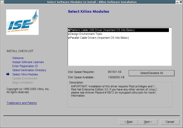 Estos drivers están compilados para un kernel 2.4.x... así que no valen para un 2.6.8 que es el que yo tengo... tal vez instalando ISE en una Debian/Sarge con Kernel 2.4 no salgan estos mensajes de error... no lo he probado todavía.