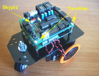 En SKYBOT se han añadido más sensores, en concreto lleva 4 sensores de infrarrojos de corta distancia, dos sensores de contacto y un sensor de luz. Los motores siguen siendo los servos Futaba 3003, trucados para poder funcionar como motores de corriente continua normales.