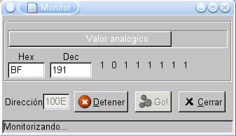 4)Modo Monitor. Se introduce la dirección que se quiere comprobar, y periodicamente se accece al servicio LOAD para mostrar lo que se encuentra en ella. Resulta muy útil para comprobar el estado de sensores conectados en puertos digitales del stargate. |
