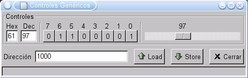 3) Control genérico. Desde esta ventana se tiene acceso a los servicos LOAD y STORE. Los datos se visualizan en binario, decimal, hexadecimal y en una barra de desplazamiento (datos analógicos). |