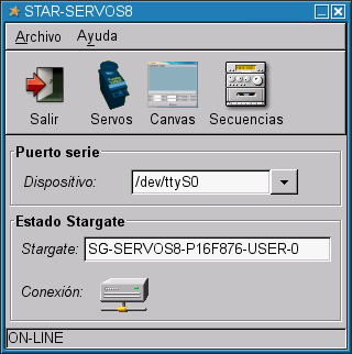 El programa star-servos8 permite manejar hasta 8 servos del tipo Futaba 3003 o compatibles. El posicionamiento se puede hacer mediante barras de desplazamiento o usando un canvas. De una manera muy sencilla se pueden grabar las posiciones de los servos para generar secuencias de movimiento, que se pueden grabar en un fichero para recuperarlas posteriormente.