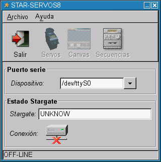 Ventana inicial, que da acceso al resto de ventanas de control. Permite configurar el dispositivo serie en el que está conectado el stargate. Muestra en todo comento el identificador del stargate y el estado de la conexión. |
