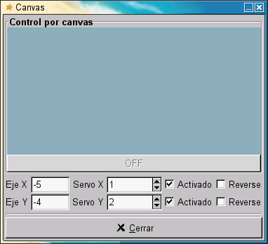 Ventana de control por canvas. Moviendo el ratón por la zona azul se actúa sobre los dos servos asociados. En este ejemplo, el servo 1 se controla con el eje X y el servo 2 con el Y. Se pueden habrir tantas ventanas de control por canvas como se quiera. Este tipo de control resulta especialmente últil cuando se está moviendo una cámara con dos grados de libertad. |