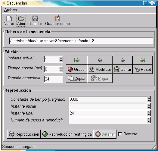 Ventana de grabación de secuencias. En cada instante se puede grabar una posición de los servos (similar a los “fotogramas” en el mundo de la animación). Mediante los botones de edición podemos recorrer todos los instantes. Pulsando el botón de reproducción ejecutamos la secuencia de movimiento grabada. Estas secuencias se pueden grabar en ficheros para luego leerlos posteriormente. |