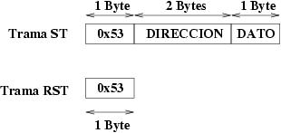 El cliente envía la trama ST en la que se especifica el código de la trama, la dirección y el dato que se quiere escribir. Para el envío de la dirección, primero se manda el byte menos significativo y luego el de mayor peso. El servidor responde con la trama RST.