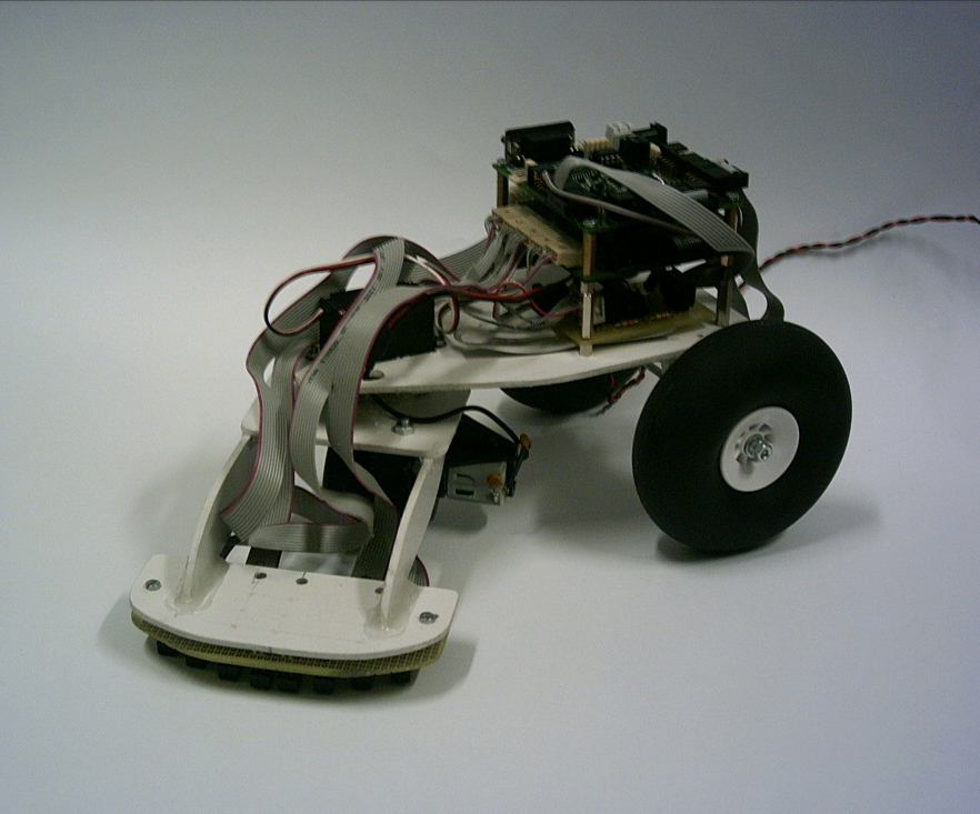 Para el robot utilizaremos motores de corriente contínua (cc). Estos motores son muy baratos, sin embargo tienen el inconveniente de que giran muy deprisa pero tienen muy poca fuerza (es como intentar arrancar un coche en cuarta). Es necesario utilizar una serie de engranajes para conseguir mayor fuerza a costa de perder velocidad. Una solución muy empleada es utilizar servomecanismos, como por ejemplo los Futaba 3003 o compatibles, que se pueden conseguir en cualquier tienda de aeromodelismo. Tienen una fuerza y velocidad muy adecuados para hacer pequeños robots móviles de aprendizaje que se puedan desplazar por pequeñas superdicies, como la de una mesa. Para convertirlos en motores de corriente contínua normales es preciso “trucarlos”. Para ello hay que abrirlos, eliminar la electrónica interna y los topes mecánicos y soldar un par de cables. Todo el proceso está descrito aquí