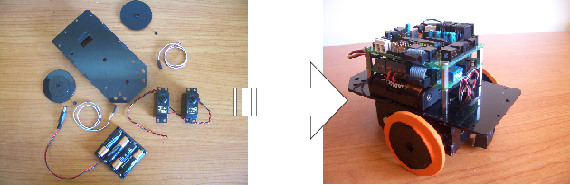 Primero finalizaremos la estructura del robot, montando los servos sobre el chásis, terminando las ruedas y colocando la rueda loca trasera. Seguir los pasos descritos aquí.