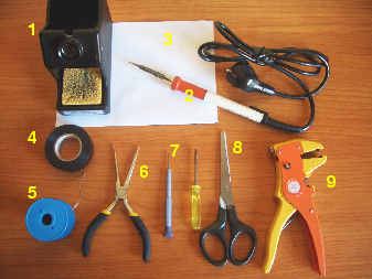 1) Soporte para soldador 2) Soldador 3) Un folio en blanco 4) Rollo de cinta aislante negra 5) Rollo de estaño de 1mm 6) Alicates de cabeza plana 7) Destornilladores de cabeza plana 8) Tijeras 9) Pelacables (opcional) |